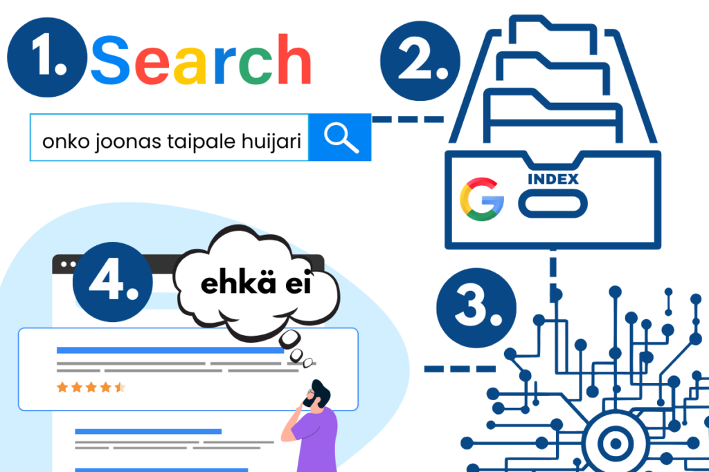 Kun käyttäjä tekee haun, sitä lähdetään etsimään tästä Googlen ”puhelinluettelosta”. Jos sivusi ei ole syystä tai toisesta päätynyt indeksiin, arvaat varmaan lopputuloksen. Kukaan ei löydä sivuasi hakukoneista.
